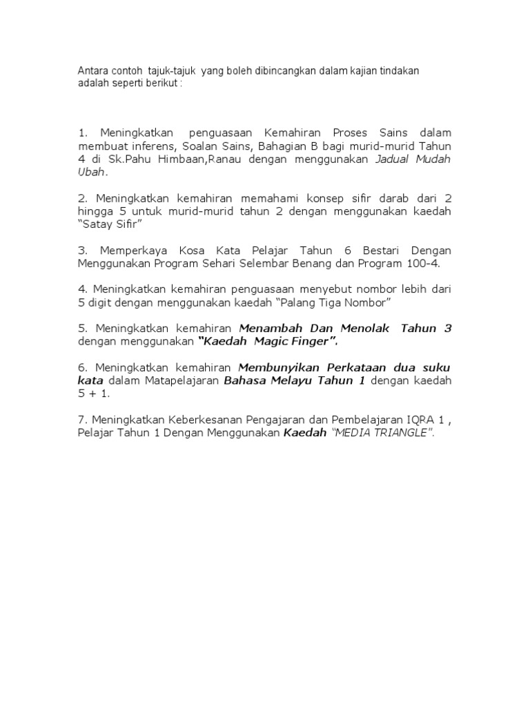 Web CONTOH KAJIAN TINDAKAN SENARAI NAMA AHLI JAWATAN KUASA PENASIHAT. Corak dan Gaya Pembelajaran Pelajar Perakaunan 1 file s 56940 KB Download KT3. Web 1 Mengenal pasti idea 2 Pencarian fakta Langkah Langkah 3 Perancangan pelan model Kurt model Kurt tindakan Lewin Lewin 4.